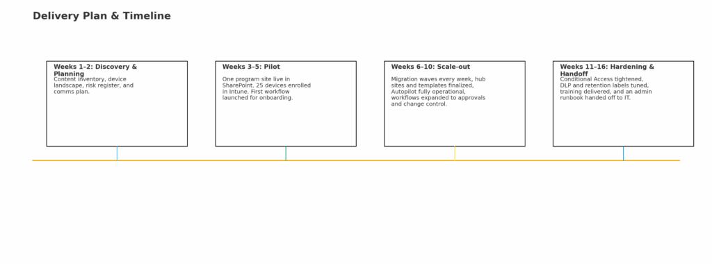 Migration waves every week, hub sites and templates finalized, Autopilot fully operational, workflows expanded to approvals and change control.Weeks 11–16: Hardening and handoff